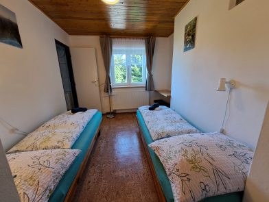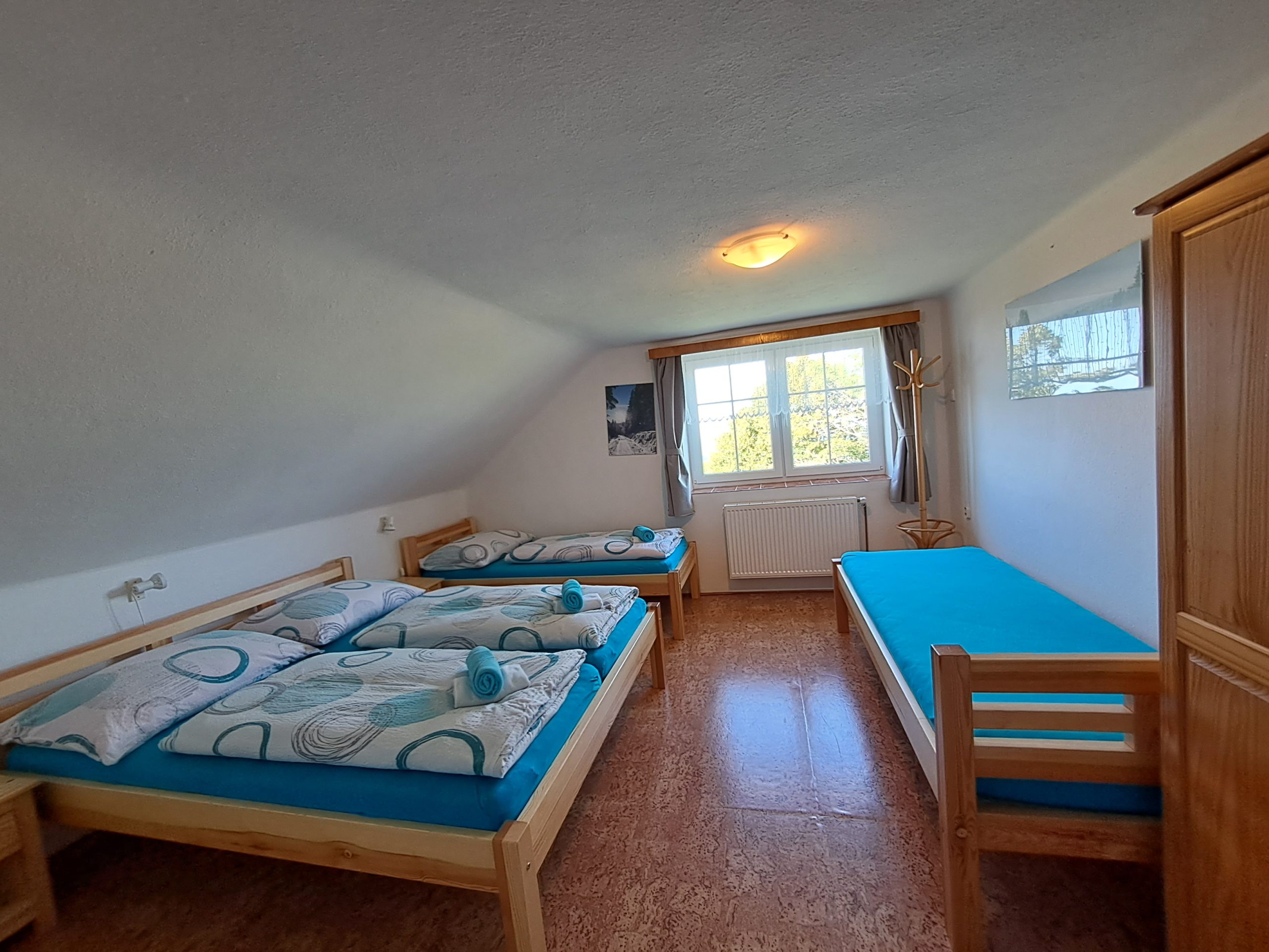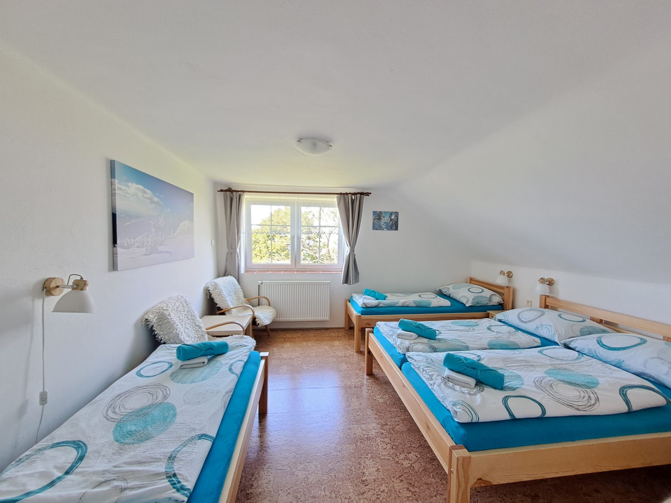 3x čtyřlůžkový pokoj – 1 pokoj má své vlastní sociální zařízení, 2 pokoje spolu sdílejí sociální zařízení (na tyto pokoje neubytováváme hosty, kteří se neznají)
