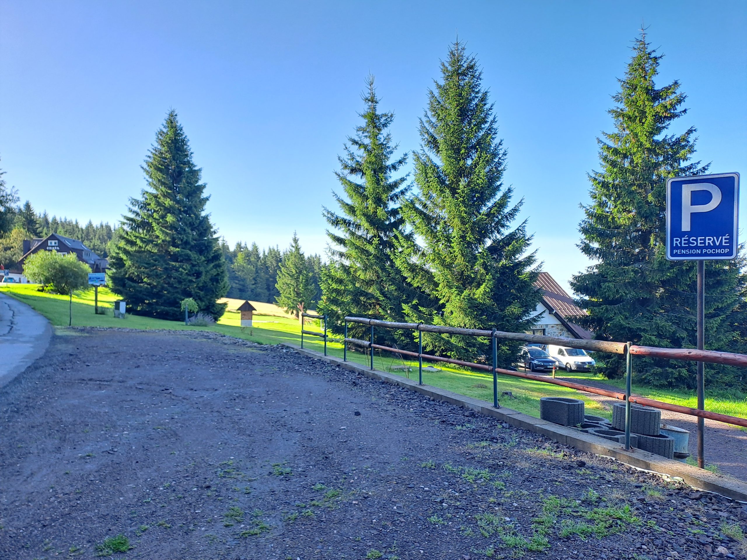 Příjezd po zpevněné asfaltové cestě, v zimních měsících se sněhovými řetězy. Parkování pro 8 aut v blízkosti objektu, přístup k domu po travnaté pěšině cca 20m.